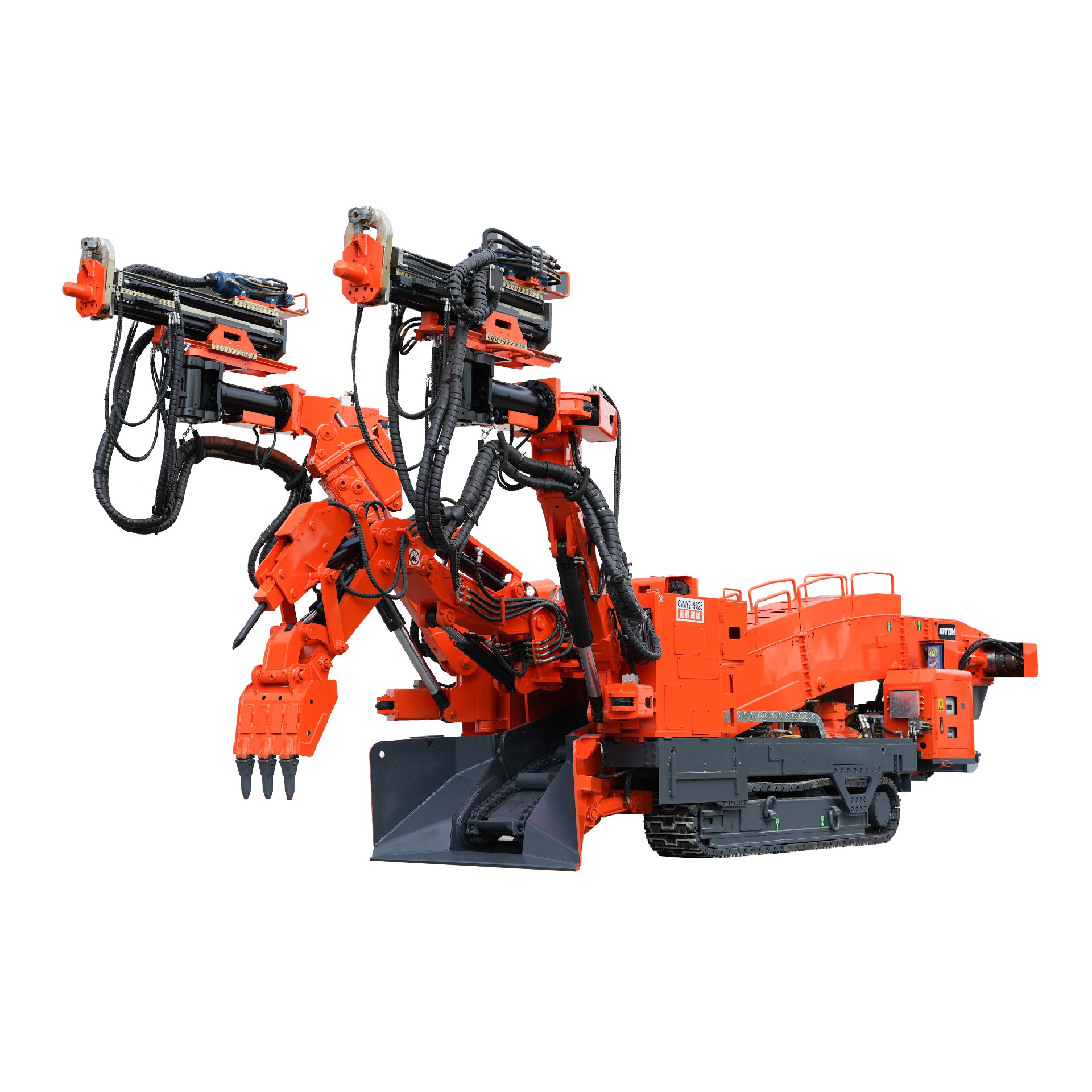 煤礦用鉆裝錨機組是一種集鑿巖、裝載、支護三種功能于一體的高效連續作業裝備。主要用于礦山巖巷、引水洞以及其它工程巷道中的掘進作業。其應用提高了掘進速度,降低了工人的勞動強度,掘進施工作業提高了安全,很好的實現了巖巷快速掘進的機械化作業需求同時解決了中小巷道多種設備錯不開車的問題。鉆裝錨機組兩個鉆臂可同時對巷道工作面迎頭打放炮孔,也可以同時打幫、頂錨桿孔。反鏟機構扒臂扒取遠處的巖石,送入刮板運輸機,刮板運輸機從尾部將巖石卸入礦車或皮帶運輸機中,也可以用扒斗來清理工作面。扒臂上集成破碎錘,使用時不需拆卸,當遇到大塊巖石可以使用扒臂上破碎錘進行破碎。